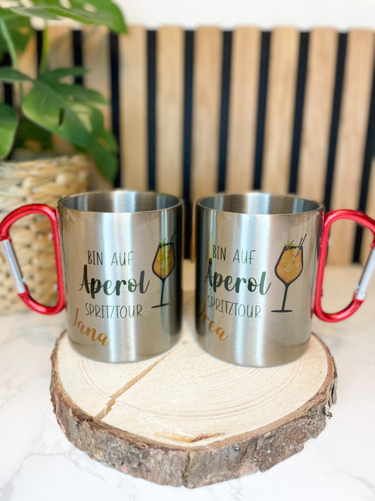 Personalisierter Edelstahlbecher mit Karabiner, Partypeace für JGA, Festival, Fasnet, Tasse Aperol Spritztour