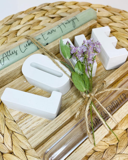 Geschenkset zur Hochzeit / Raysin Buchstaben Love/ Kerze mit Herz und kleiner Grußbotschaft verschiedene Farben
