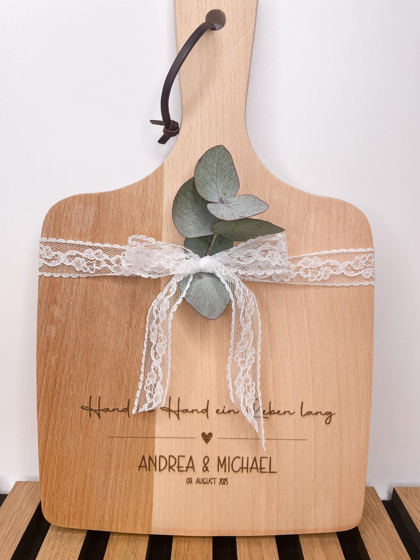 Egal, ob zur Hochzeit, zum Hochzeitstag oder zur Goldenen Hochzeit – dieses Schneidebrett ist ein besonderes Erinnerungsstück, das in der Küche des Paares ein Leben lang begleiten wird. Es erinnert sie daran, wie sie Hand in Hand durch all die Jahre gehen, stets miteinander, in Liebe und Partnerschaft.